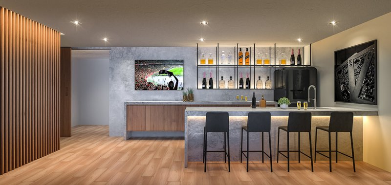 O lazer do projeto fica distribuídos entre térreo e Rooftop, e studios com lazer independente.