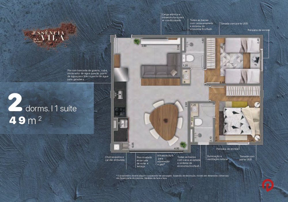 O projeto conta com apartamentos 2 e 3 dormitórios, e plantas de 40 m² ( 2 dormitórios ), 49 m² ( 2 dormitórios sendo 1 suíte ), 60 m² ( 3 dormitórios sendo 1 suíte ) e coberturas de 81 a 109 m² ( 3 e 4 dormitórios com suite ).