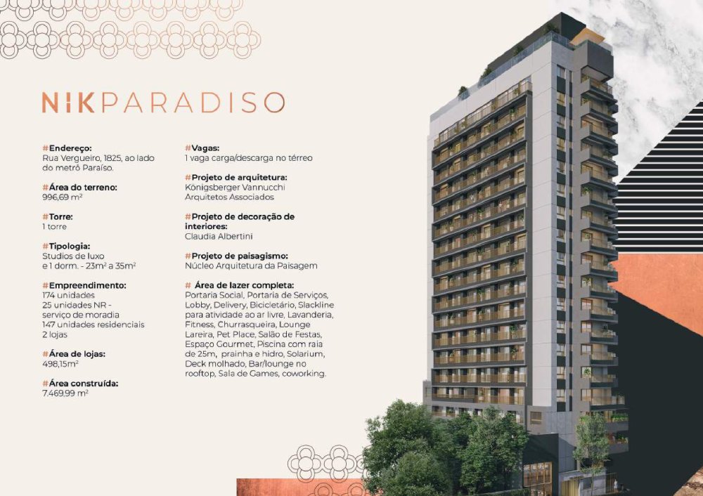 Não perca a oportunidade de morar no NIK PARADISO, um studio moderno e completo, com lazer e comodidade em um dos melhores bairros de São Paulo!